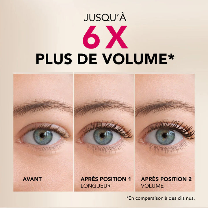 Up to 6x more volume* and visibly stronger, thicker lashes in 4 weeks**. Volumizing mascara with 2-in-1 transformable brush: - 2 actions: volume and length - Dual-position brush