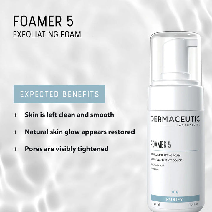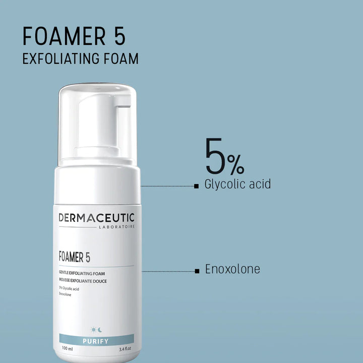 Foamer 5 effectively purifies the skin. The glycolic acid exfoliates the skin and removes dead cells and impurities, while enoxolone soothes the skin.