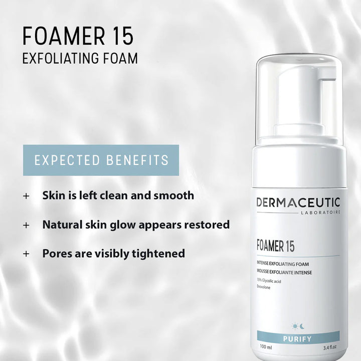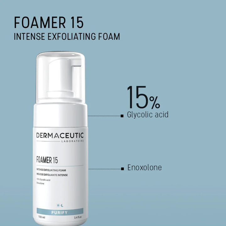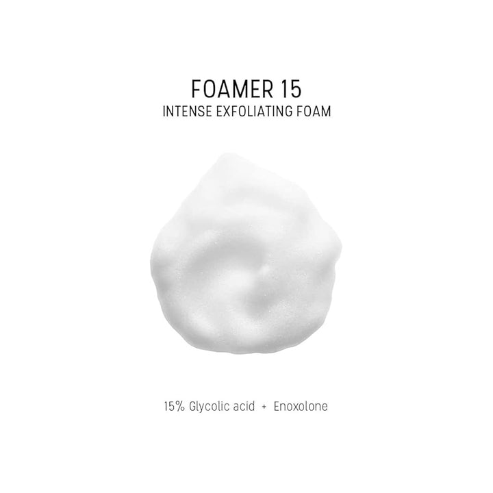 Foamer 15 effectively purifies the skin. The glycolic acid exfoliates the skin and removes dead cells and impurities, while enoxolone soothes the skin.