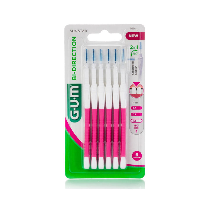 The GUM Bi-Direction interdental brush has a clever rotating design that allows you to tilt in two different positions so you can clean different parts of your mouth. We recommend that you use it at least once a day, preferably after your dinner.