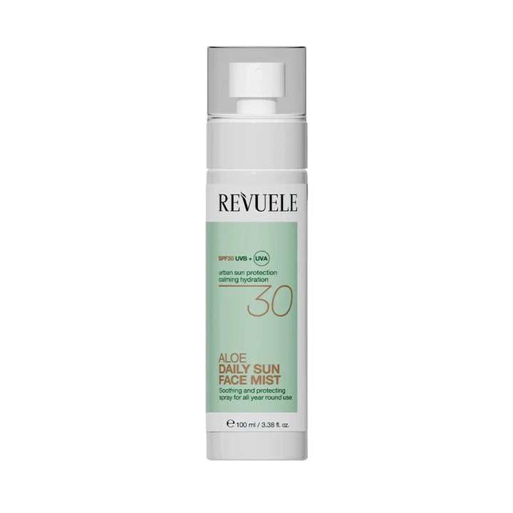 REVUELE Aloe Daily Sun Face Mist SPF 30, 100 ml – instantly refresh and protect your skin with soothing aloe! This lightweight mist hydrates, calms, and provides broad-spectrum sun protection for a radiant, healthy glow anytime, anywhere. Perfect for sensitive skin on the go!