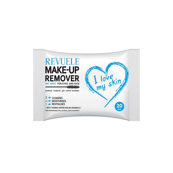 Revuele Wet wipes I LOVE MY SKIN MAKE-UP REMOVER for eyes and face with green tea and cucumber The new supersoft wet wipes remove make-up and gently cleanse your skin leaving it clean, toned and radiant. They are specially designed to easily remove make-up and other impurities from the face, lips and eyelids without rubbing and keeping skin’s natural moisture balance. The innovative lotion is enriched with active ingredients with soothing and antioxidant properties making it ideal even for the most sensitive skin. Formulated to minimize the risk of allergies. No need to wash off. Alcohol, parabens and silicone free.
