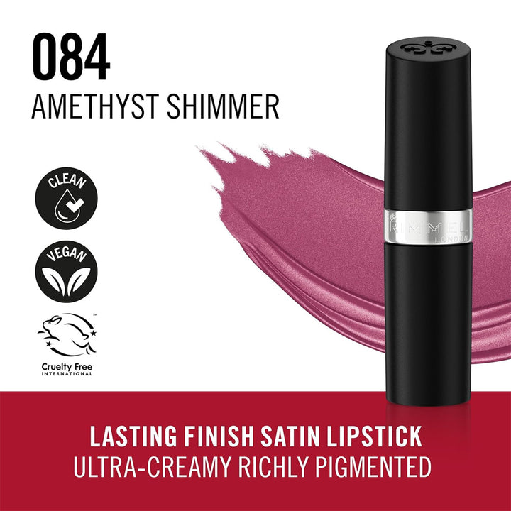 Rimmel London Lasting Finish Lipstick in shade 084 Amethyst Shimmer is a long-lasting lipstick that provides a beautiful shimmering finish. The rich, creamy formula glides on smoothly, delivering intense colour and hydration to keep lips looking and feeling great all day long.