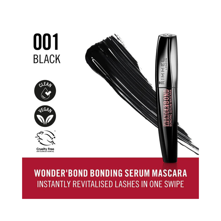 The New Rimmel Wonder'Bond Bonding Serum Mascara instantly revitalises lashes in one swipe for longer, smoother, and healthier looking lashes. Powered by Biotin Bonding Complex, with up to 350% more volume! Inspired by bond repair serums, Rimmel's unique formula visibly improves lash quality.