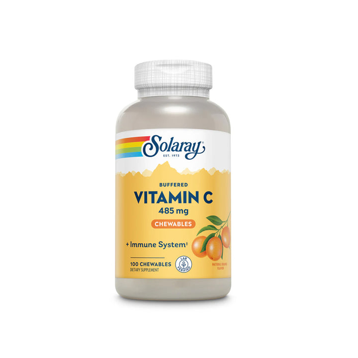 Solaray Vitamin C Buffered Chewables with natural orange flavor make adding more vitamin C to your diet a daily treat. And by combining 485 mg of vitamin C with calcium, our buffered vitamin C formula is designed to be more gentle on digestion. We also include sun-grown, natural sources of vitamin C, rose hips and acerola cherry, along with a bioflavonoid concentrate intended to enhance the activity of the vitamin while providing additional support for healthier hair, skin, and nails.