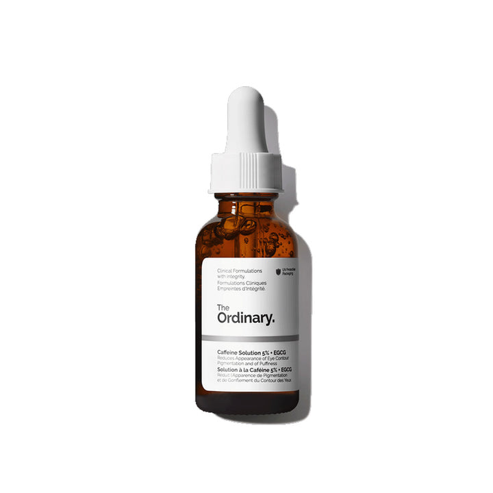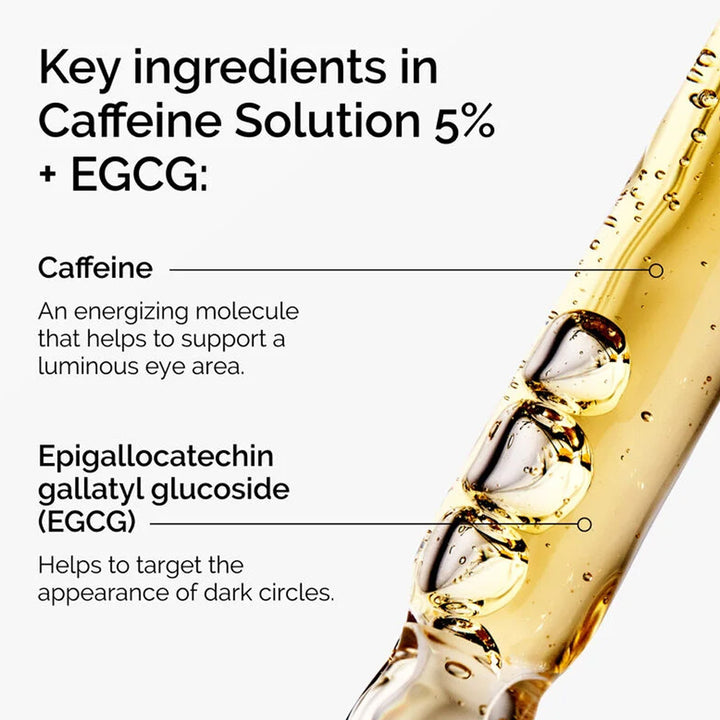 Caffeine Solution 5% + EGCG is an effective, water-based serum that targets dark circles and puffiness around the eyes, promoting under-eye brightening. Formulated with a 5% concentration of caffeine and epigallocatechin gallatyl glucoside (EGCG), this potent serum helps improve the look of tired eyes while providing a brightening effect. Caffeine works to reduce puffiness, while EGCG works to help reduce the appearance of dark circles.