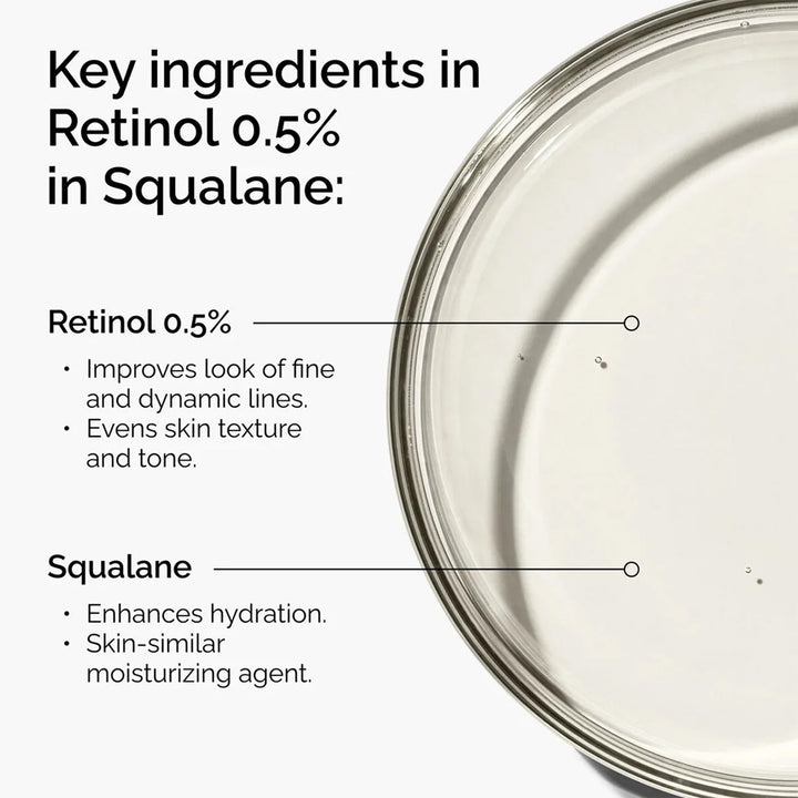 Retinol 0.5% in Squalane offers a water-free solution containing 0.5% retinol—an ingredient that improves the appearance of fine and dynamic lines that arise from a loss of collagen and elastin, while evening skin texture and tone. What’s more, this intermediate formula is supported with squalane, a moisturizing agent naturally found in your skin that enhances surface-level hydration and helps combat the dryness that can be associated with retinol use.